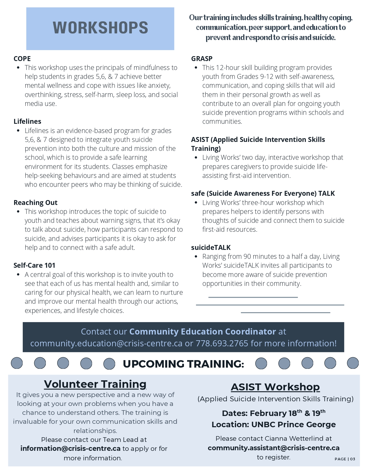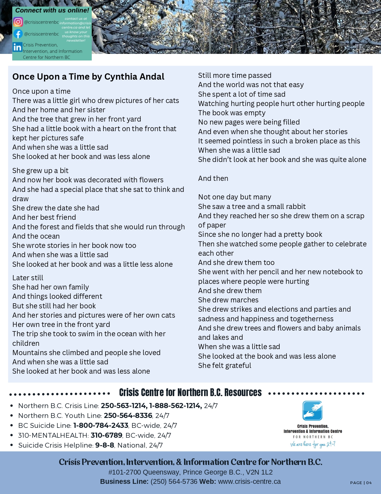 As an organization, we do our best to empower individuals to reach out to us. This is our way of reaching out to you. Informing our community of our services, discussing mental health topics, and ways to get involved with the Centre.